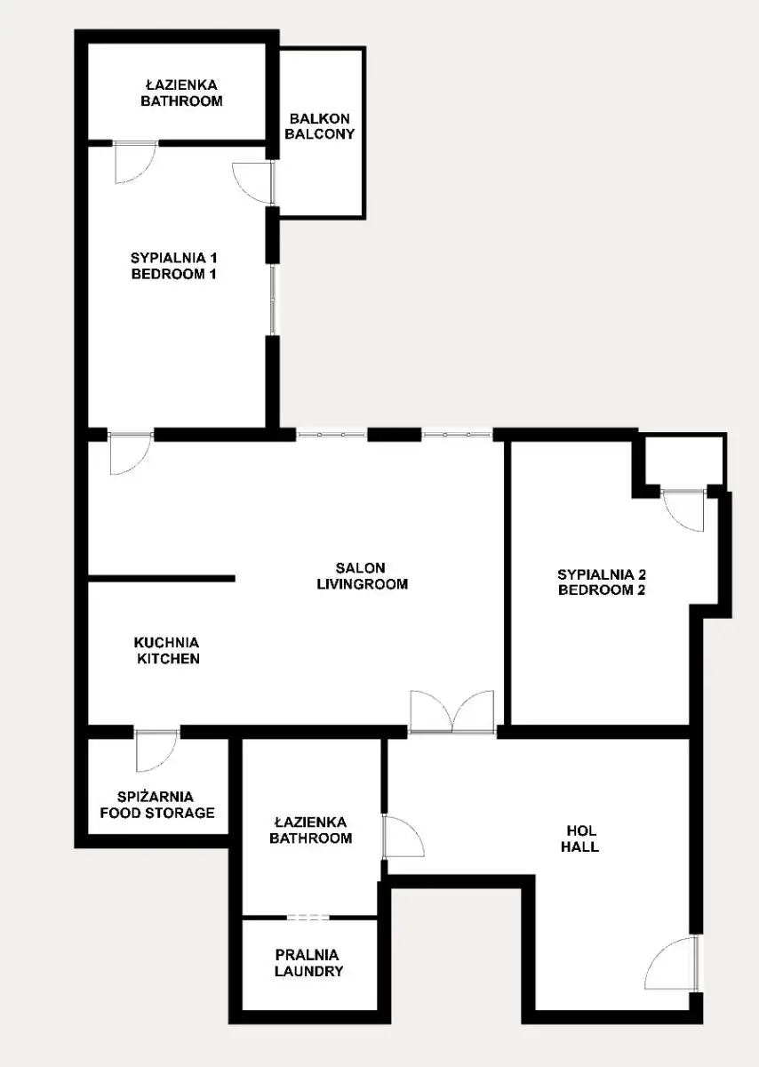 Pokoje: 2 Sypialnie, salon, otwarta kuchnia, spiżarnia, hol, łazienka z wanną, łazienka z prysznicem