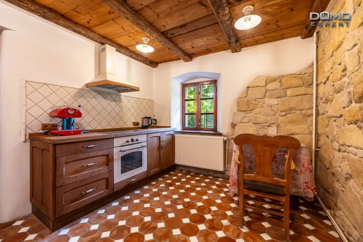 - Dębowa zabudowa robiona na wymiar, kompletnie wyposażona w sprzęt AGD