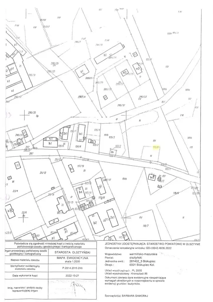 Księga wieczysta nr OL1B/0008390/6, działka nr 109/6 o powierzchni 0,8980 ha, położona w Biskupcu-Kolonii Pierwszej (obręb 1 Biskupiec Kol).