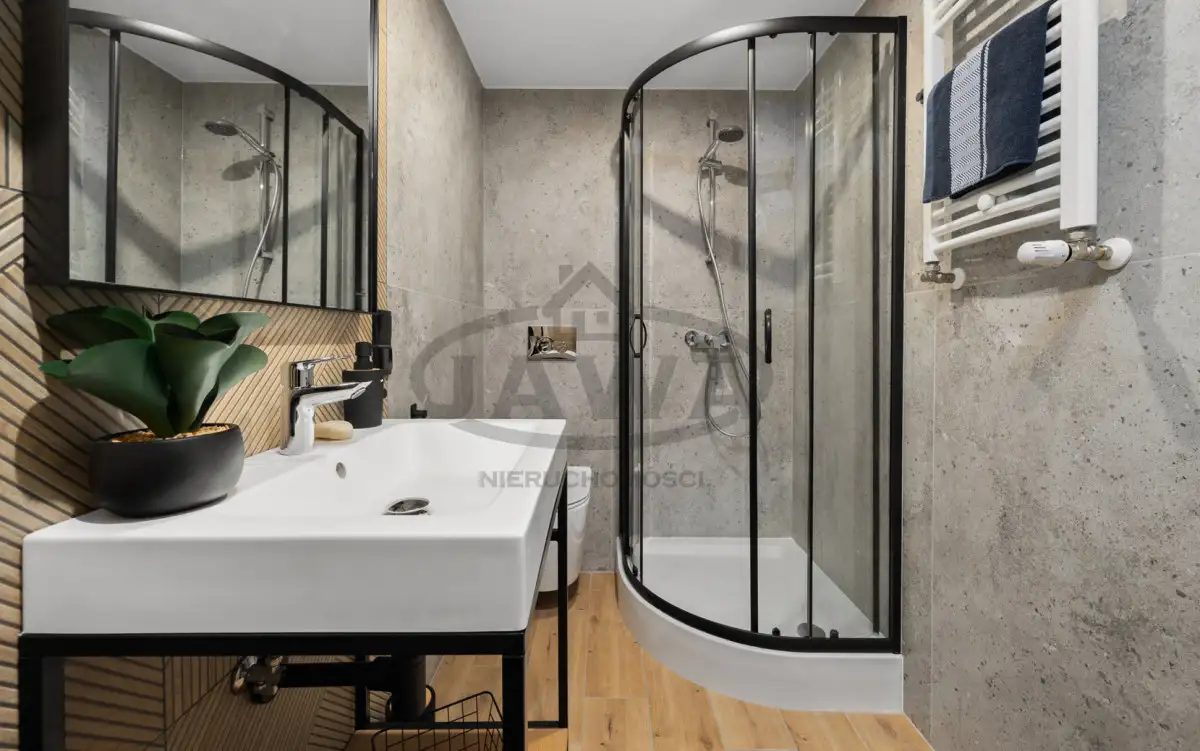 Wszystkie instalacje są nowe, co gwarantuje bezpieczeństwo i komfort użytkowania. Łazienka została wykończona z dbałością o detale, oferując nowoczesny prysznic i eleganckie płytki. W salonie oraz sypialni na podłodze zostały położone panele.